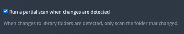 When changes to library folders are detected, only scan the folder that has changed rather than scanning the entire content location. This works together with the normal Update my library automatically setting (and requires that setting to be enabled).