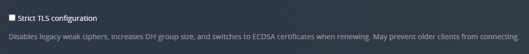 If this setting is enabled, it prevents Plex Media Server from using or accepting the deprecated TLSv1.0 and v1.1 protocols, as well as legacy weak ciphers. May prevent older clients from connecting. The vast majority of users will have no reason to enable this option (and receive no benefit from doing so).